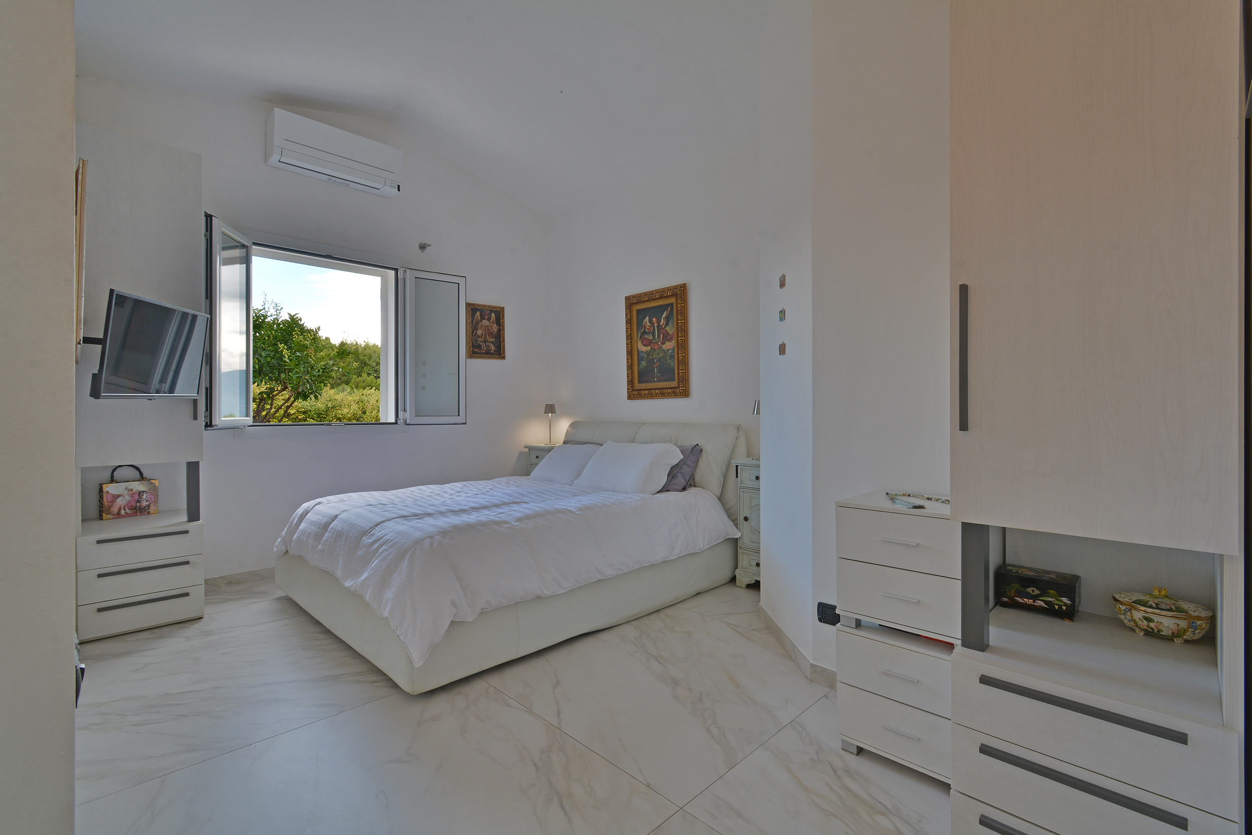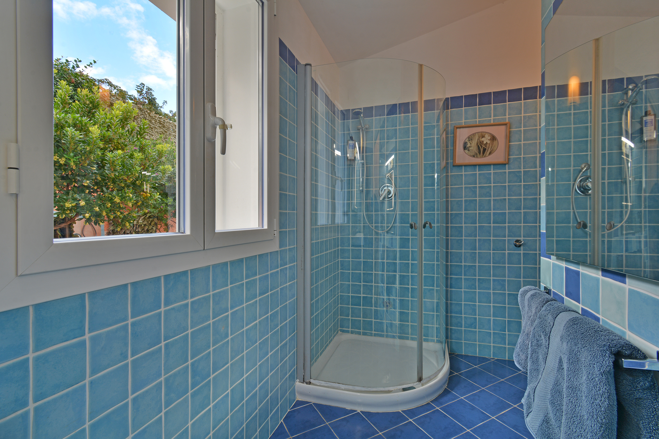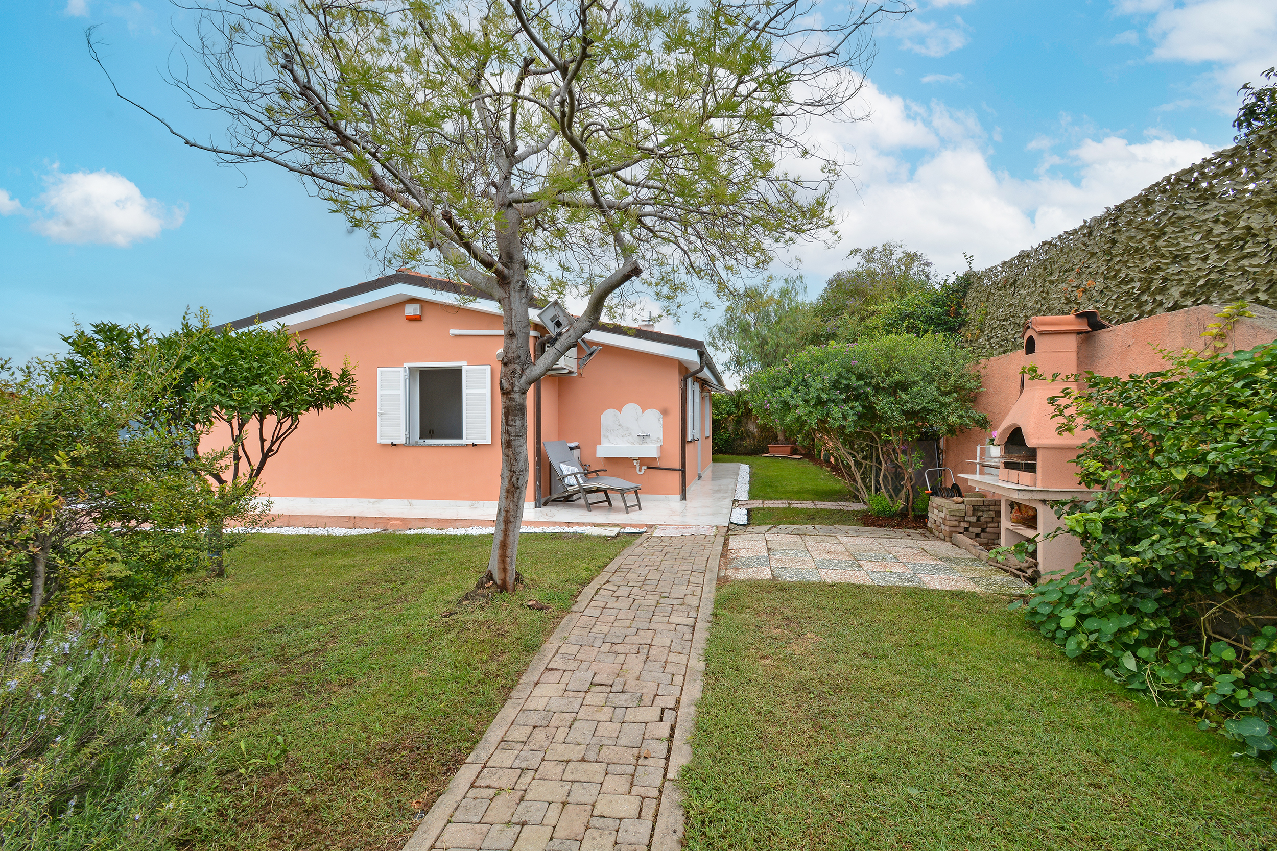 All’esterno il giardino con prato all’inglese è adornato da piante mediterranee, alberi da frutto ed agrumi.