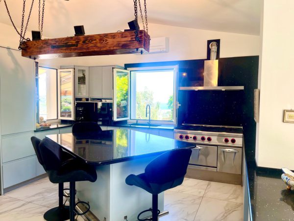 Al piano primo si trova una spaziosa cucina su misura; anche questa con piani in quarzo nero stellato, una camera da letto principale con bagno privato anch’esso con doccia ed un altro studio.