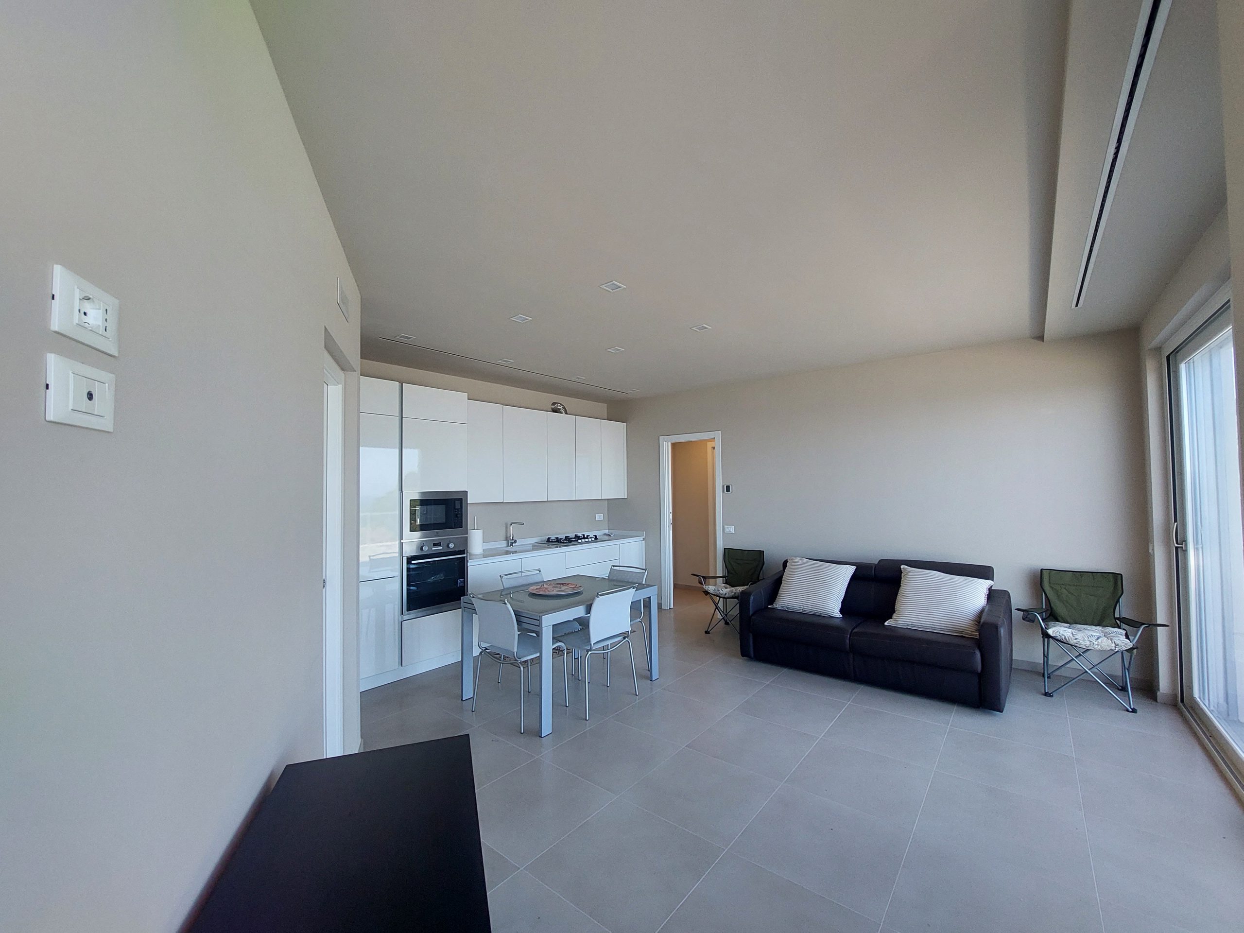 All’interno, troverai un ampio soggiorno con angolo cottura, arricchito da una doppia porta finestra che illumina l’ambiente e offre un accesso diretto alla spaziosa terrazza. La camera matrimoniale, anch’essa con accesso alla terrazza fronte mare, è il luogo ideale per rilassarsi e godersi panorami mozzafiato. Il bagno è moderno e dotato di tutte le comodità necessarie.